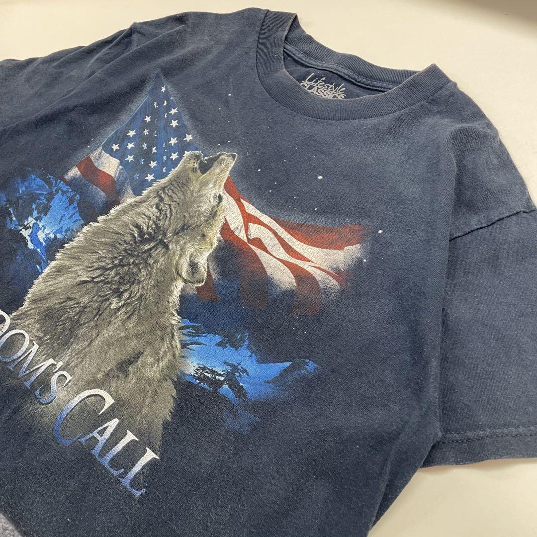 【美品】アニマル Tシャツ オオカミ フェードネイビー メンズM