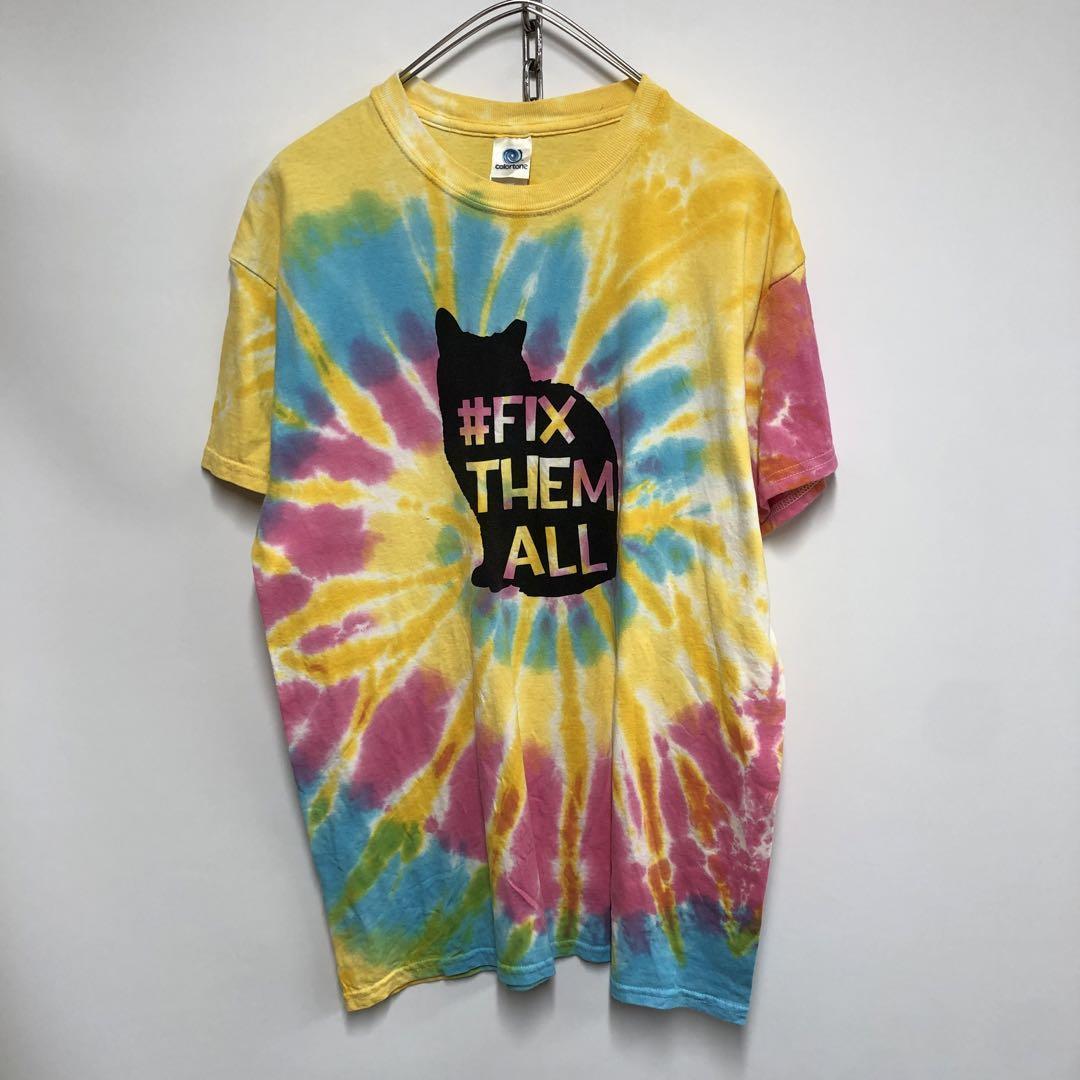 アニマルTシャツ 猫 犬 半袖 タイダイ柄 イエロー メンズM