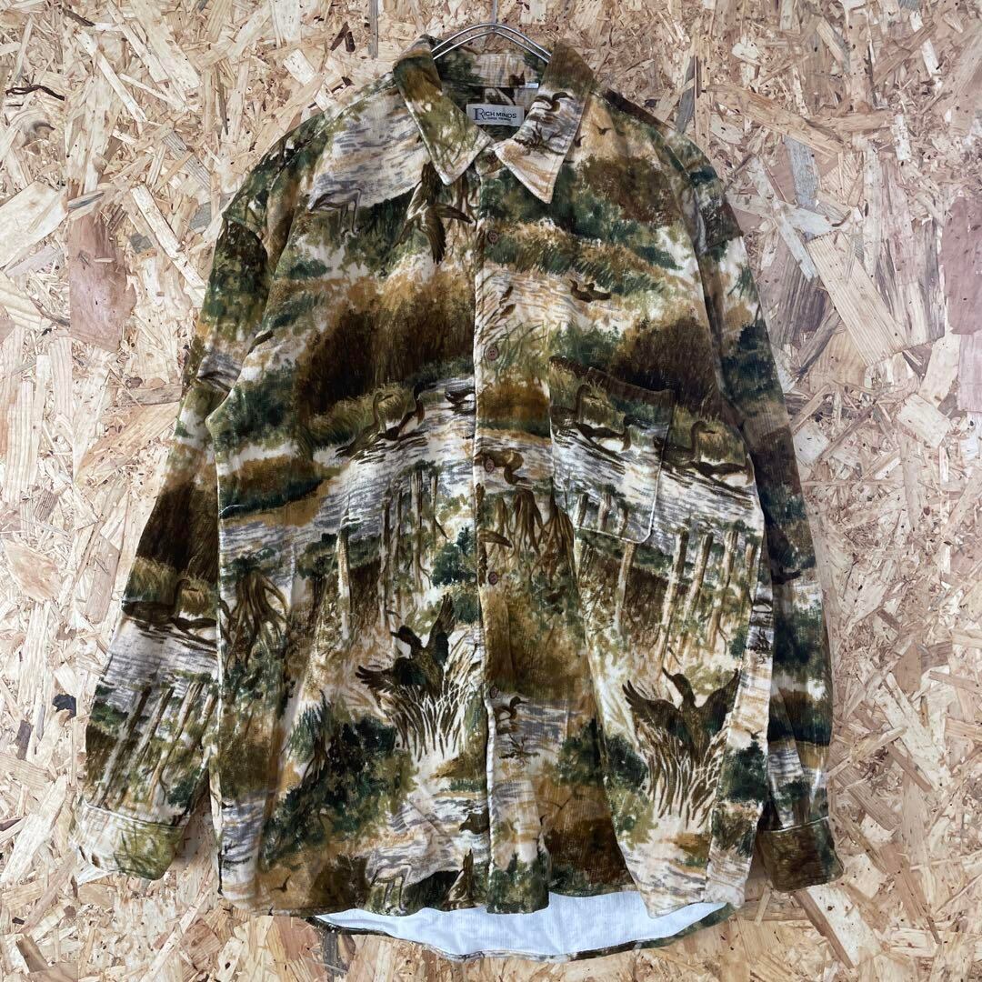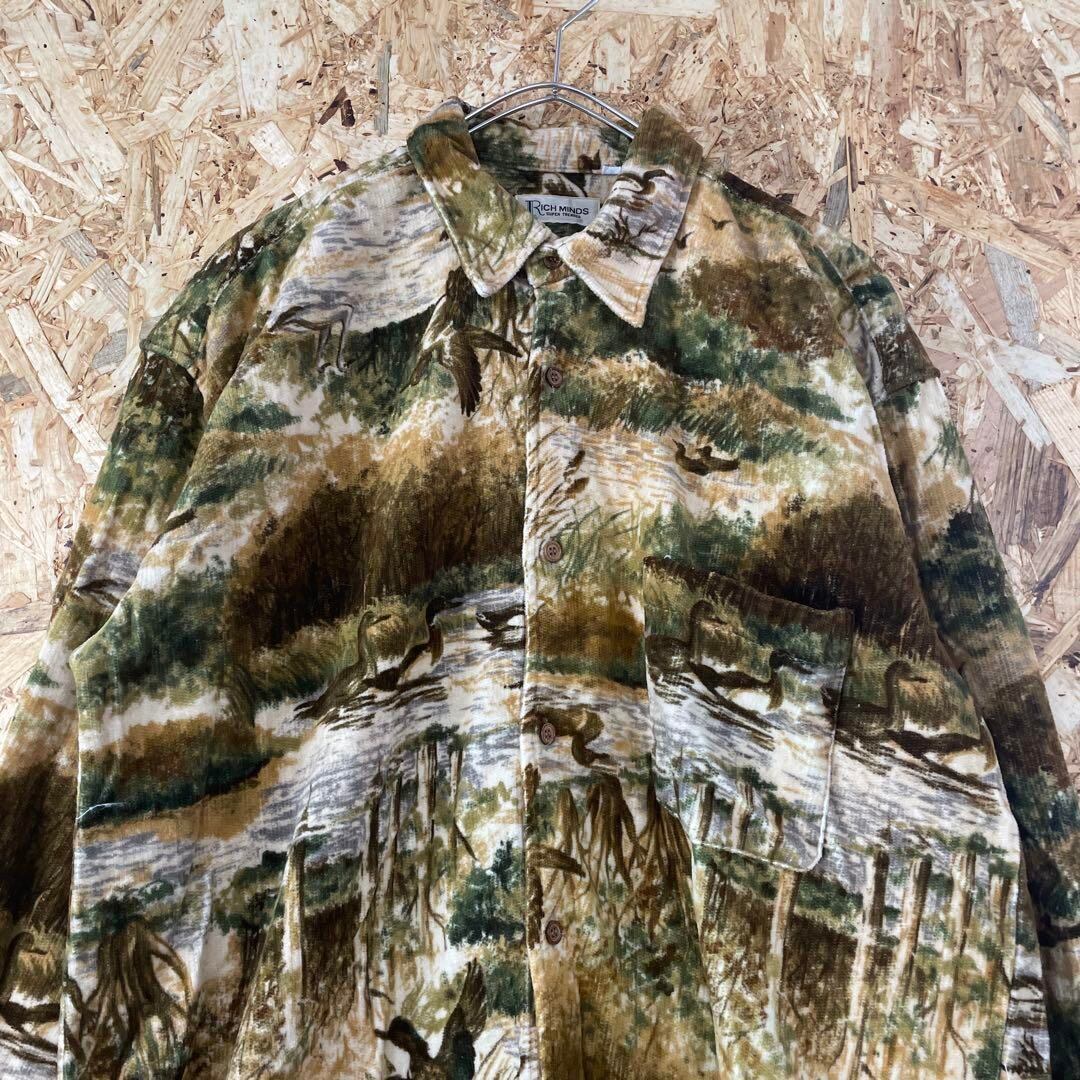 リアルツリー柄 長袖 総柄シャツ メンズF 茶 深緑 e11