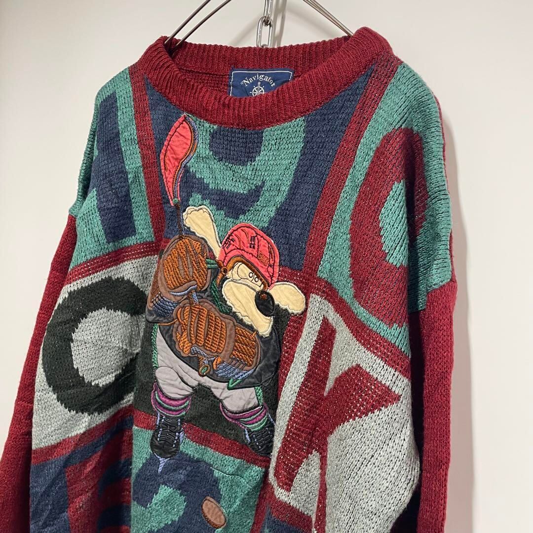 アニマル柄 刺繍 ホッケー レトロ ニット ボルドー メンズM