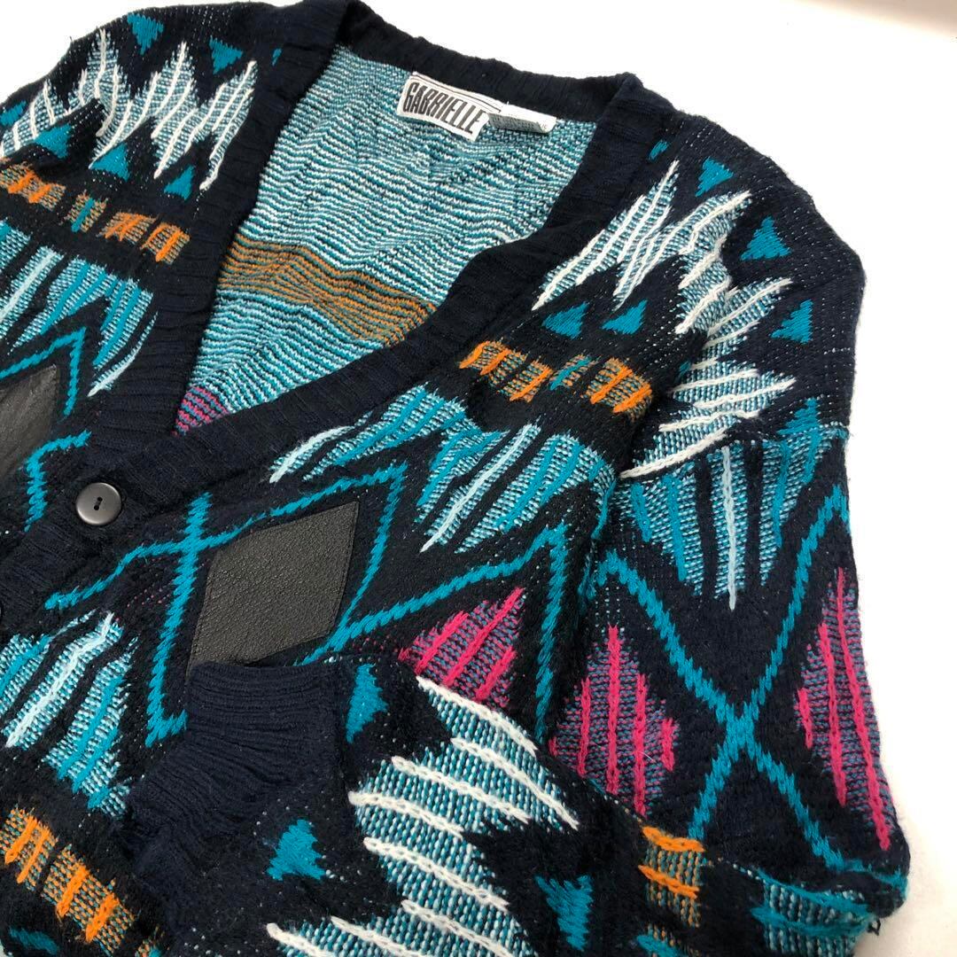 90's アクリル ニットカーディガン 総柄レトロ ブルー メンズL