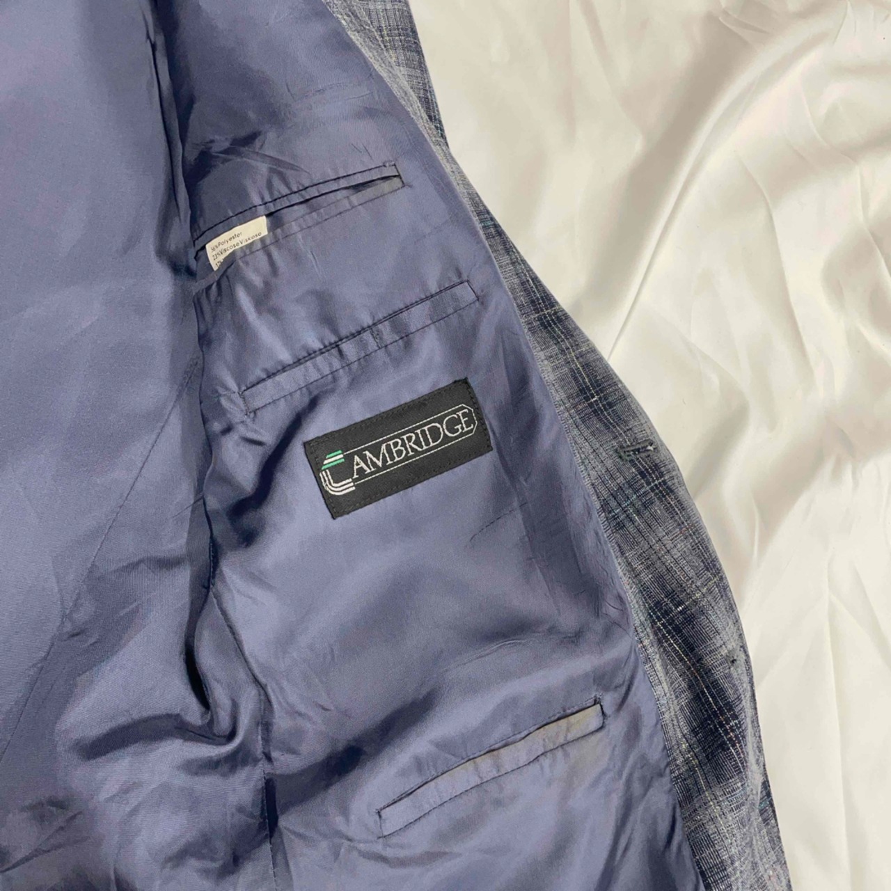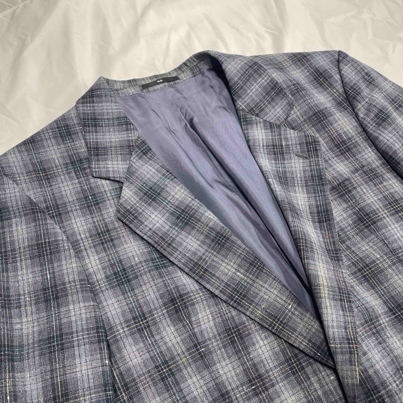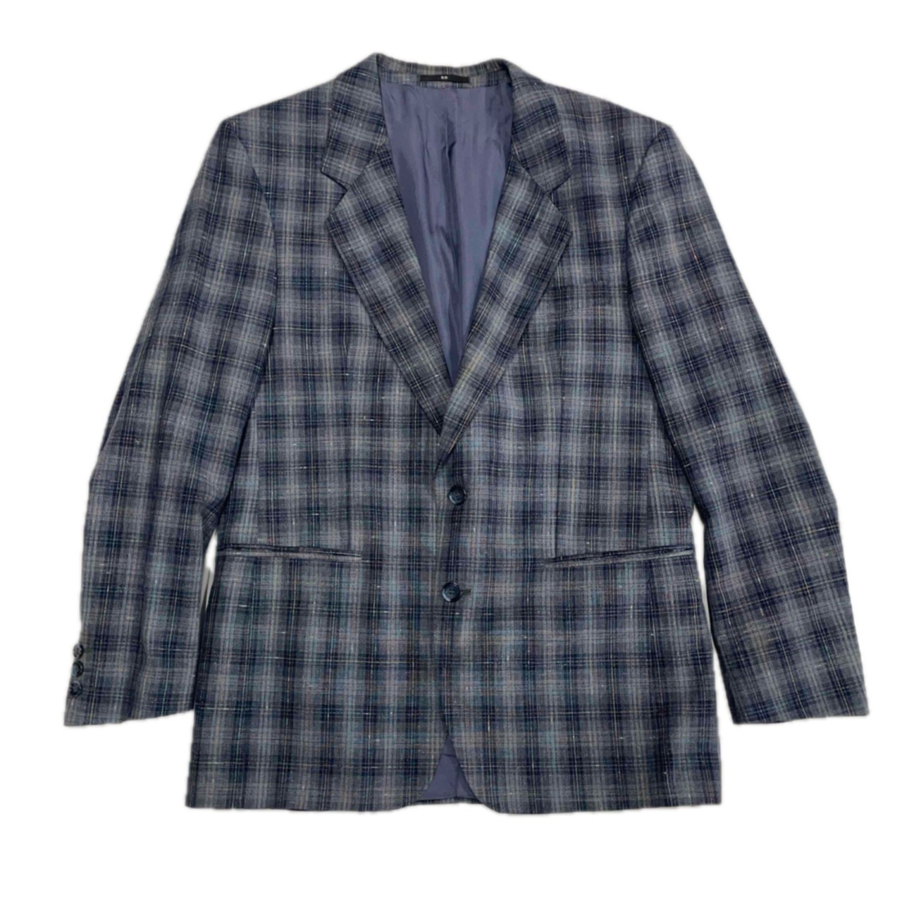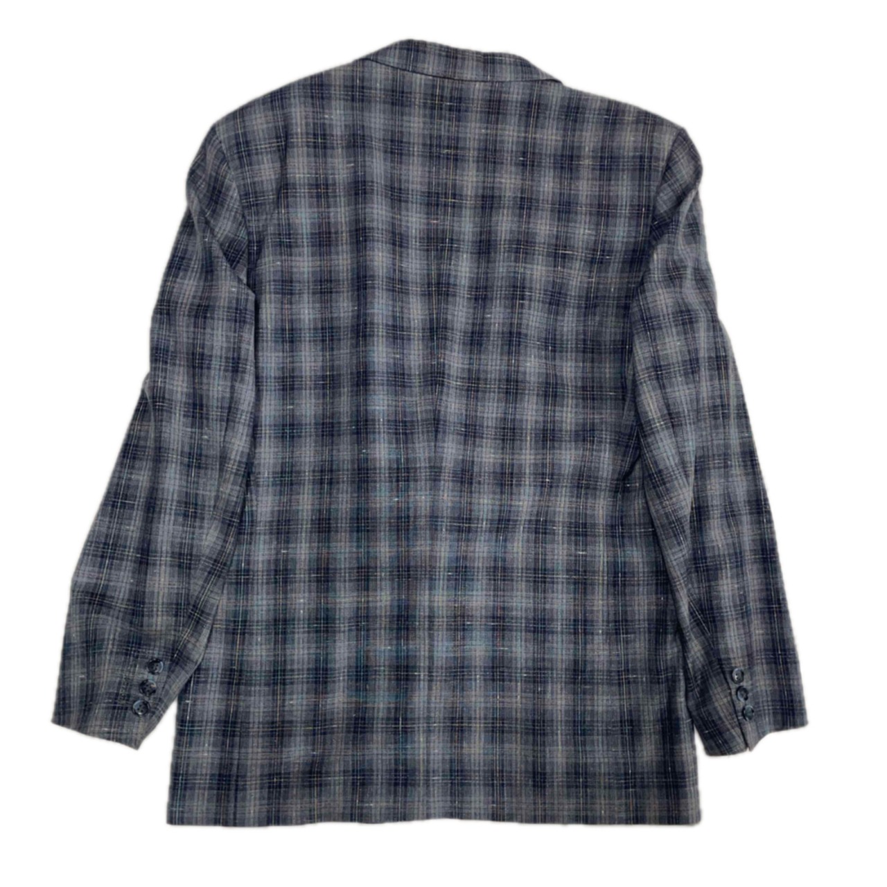 落ち着いたトーンのグレーベースにブルーのチェック柄が映えるテーラードジャケットです。