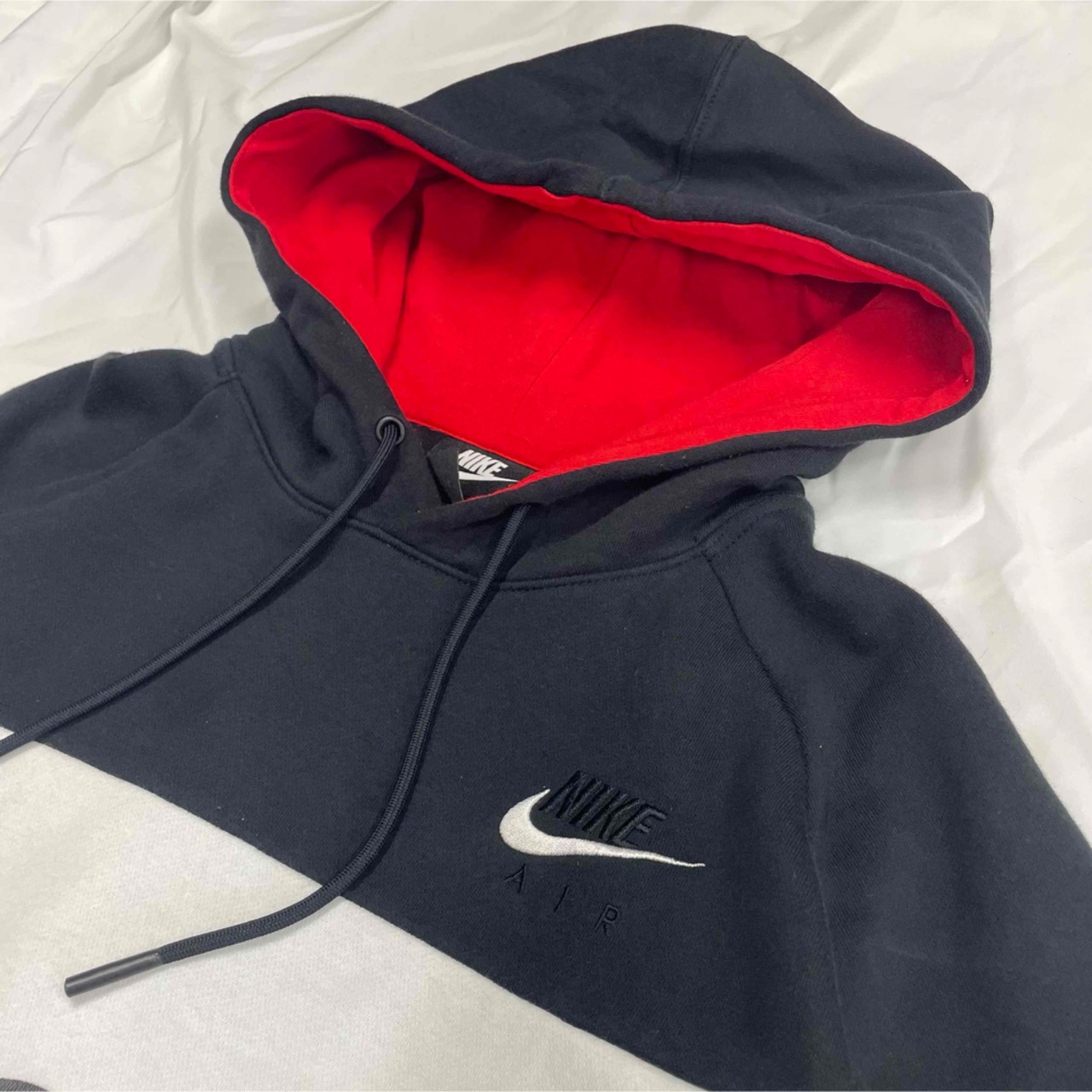 ブラック × ホワイト × レッドのカラーブロックデザインが特徴で、シンプルながら存在感のある一着。胸元の大きな「Nike Air」プリントと刺繍ロゴが目を惹きます。