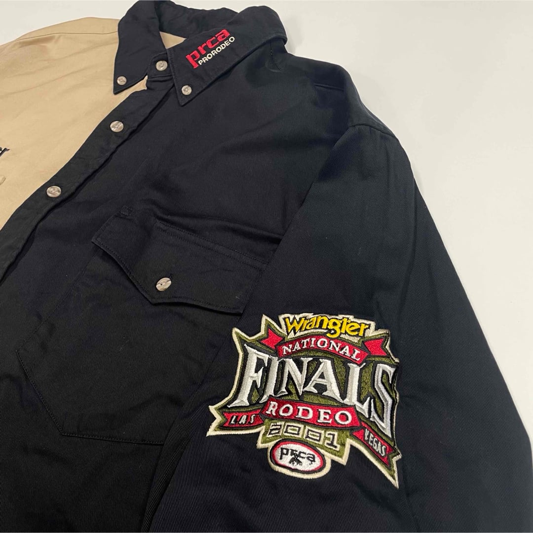 胸には「Wrangler」ロゴ刺繍、襟には「prca ProRodeo」刺繍、右袖には「Wrangler National Finals Rodeo 2001 Las Vegas」ワッペン刺繍入り。