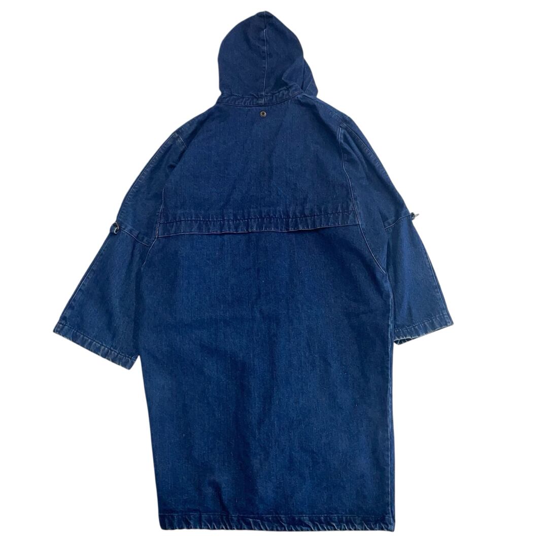 しっかりとしたコットンデニム生地を使用した、MU & CO のフーデッドロングコートです。