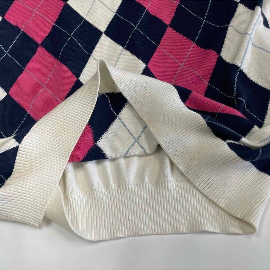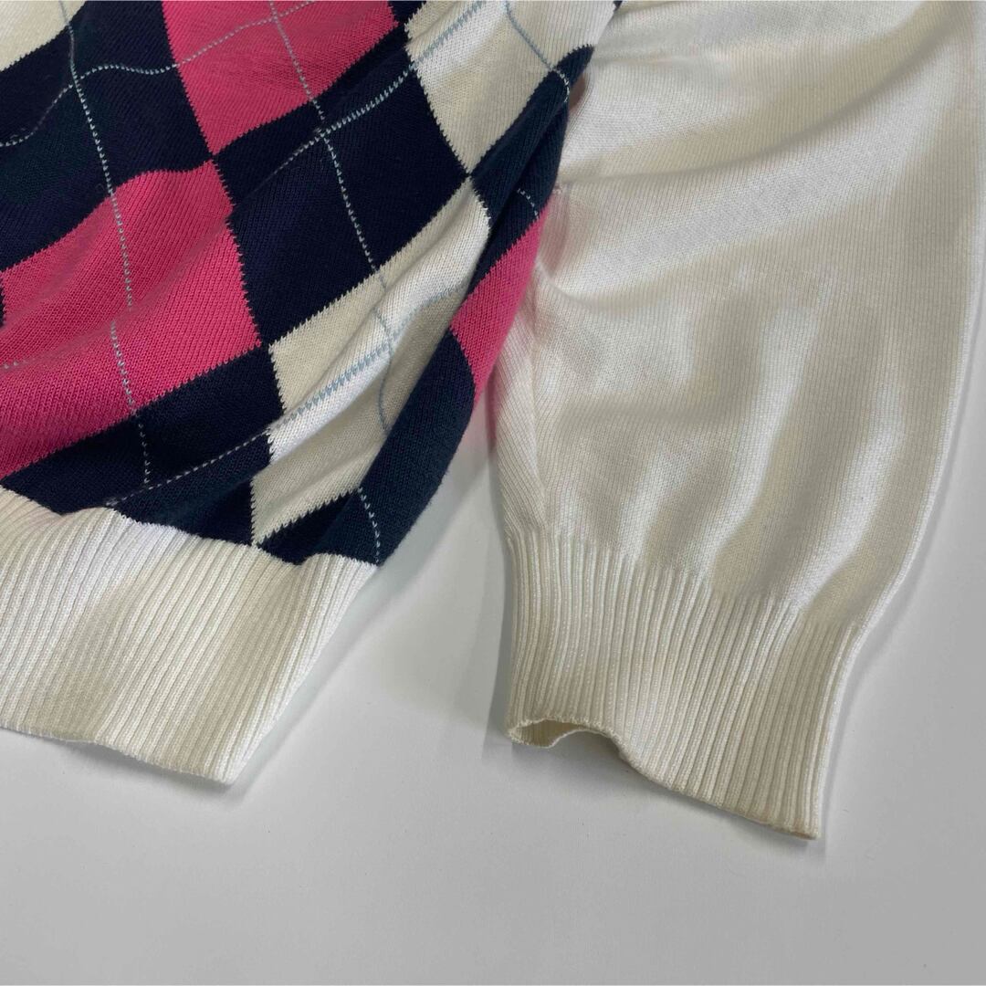 フロントはピンク×ネイビー×ホワイトの大きめダイヤ柄で、胸元には定番のワニロゴ刺繍入り。