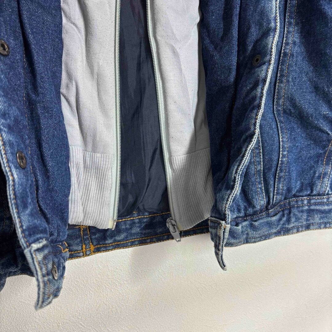 中綿入りで防寒性があり、Gジャンとパーカーをレイヤードしたようなデザインが特徴です。