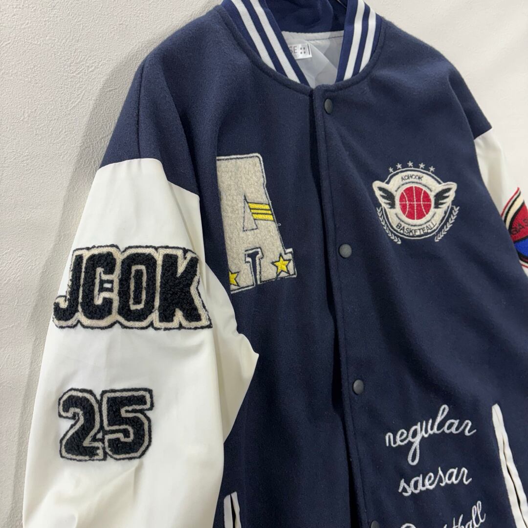 ネイビーボディ×ホワイトスリーブの配色に、フロント・袖・バックまでワッペンが入った存在感のある一着です。