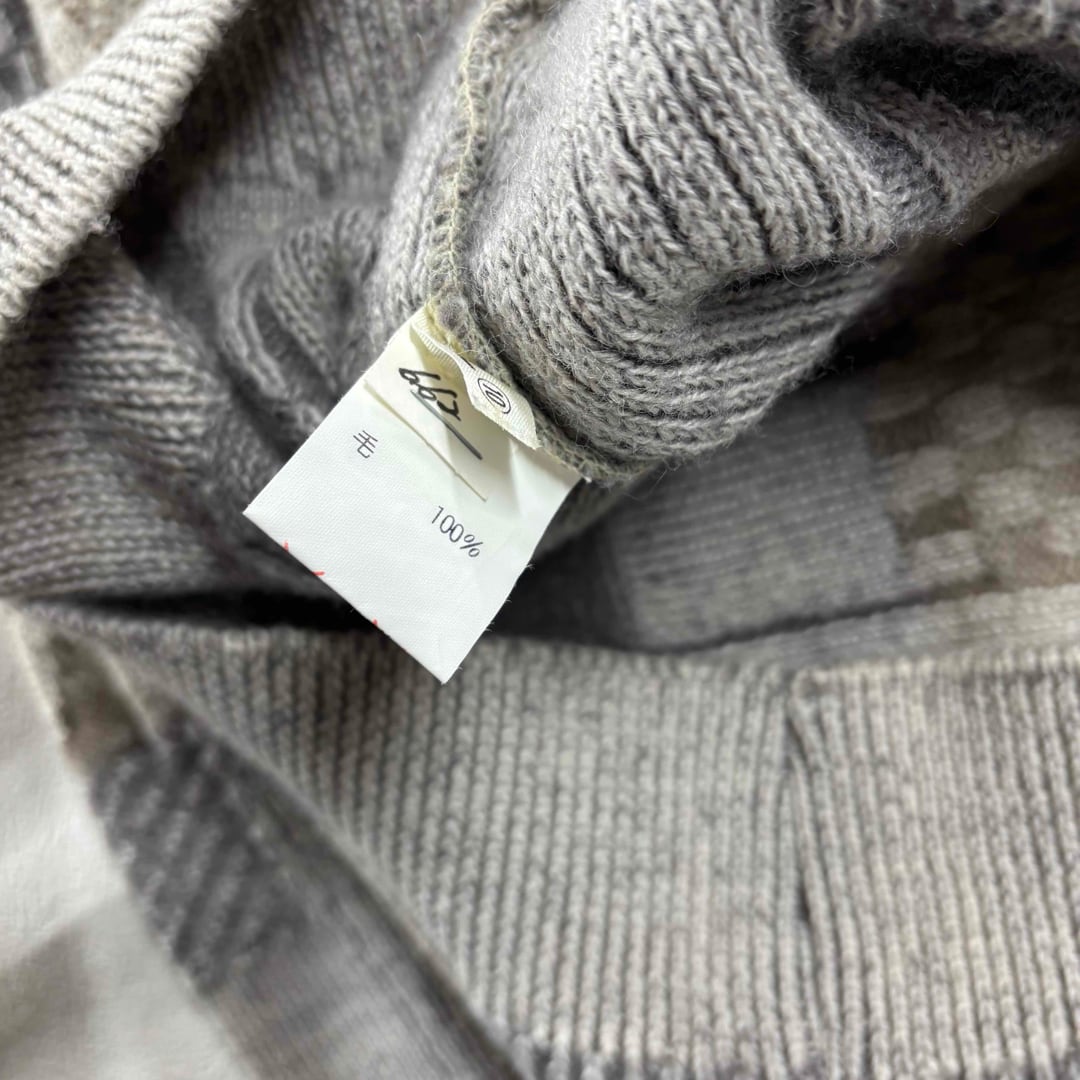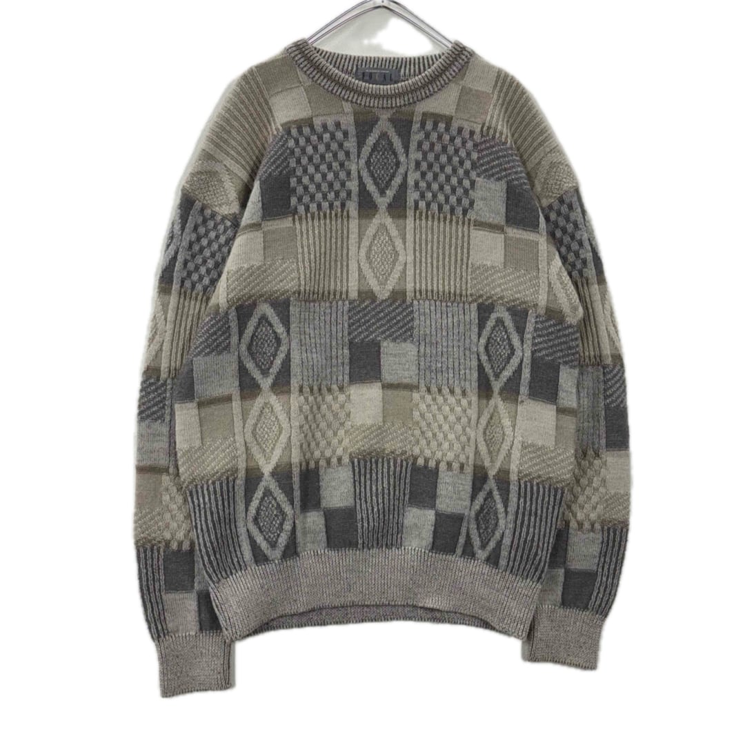 落ち着いたグレージュ〜ブラウン系カラーでまとめられた、90年代らしい総柄デザインニット。