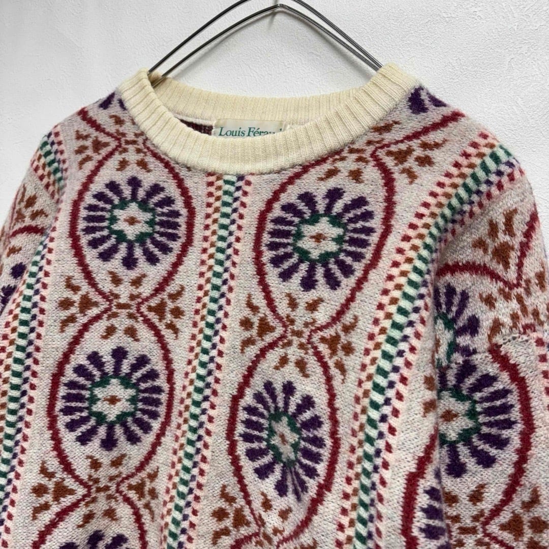 80s Louis Féraud 総柄ウールニットセーター メンズL