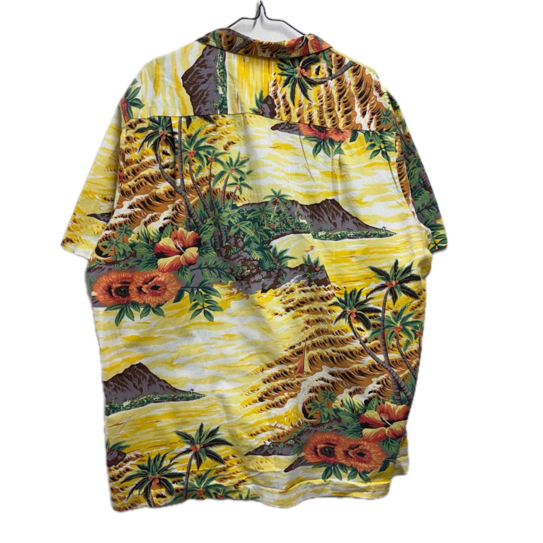 ヤシの木やビーチ、ハイビスカスが描かれた王道のアイランド柄で、発色の良いイエローベースが特徴的な1着。